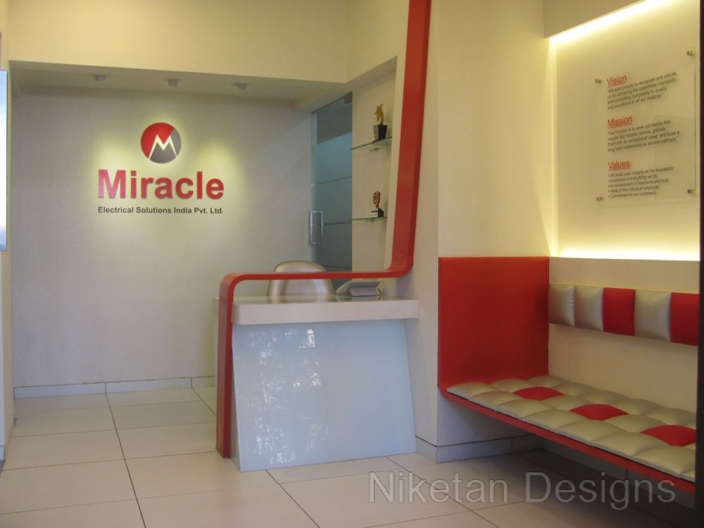 Mr. Bharat Narvekar, from Miracle Electrical solutions, wanted to have his 2BHK residential space to be transformed into an office that would reflect the zeal of his vibrant company through the colours of their brand logo. We craft fully designed a red coloured theme based office which included a well-lit reception, bright meeting space, an elegant Managing Director’s office, cafeteria and urban standard washrooms. This project was especially exciting for us as it is our USP to undertake interior design for small spaces where the challenges to innovate grow manifold and this project was just what was needed in that situation. Also, the materials used in the interiors (lamination, PU coating etc.) were as per ISO-9001 standards. After putting our ideas to practice, the office space now talks, for itself. It speaks of the stature of the company to the clients, the friendly atmosphere for the employees, a sense of pride for the Managing Director and a welcoming space for the vendors who regularly visit.