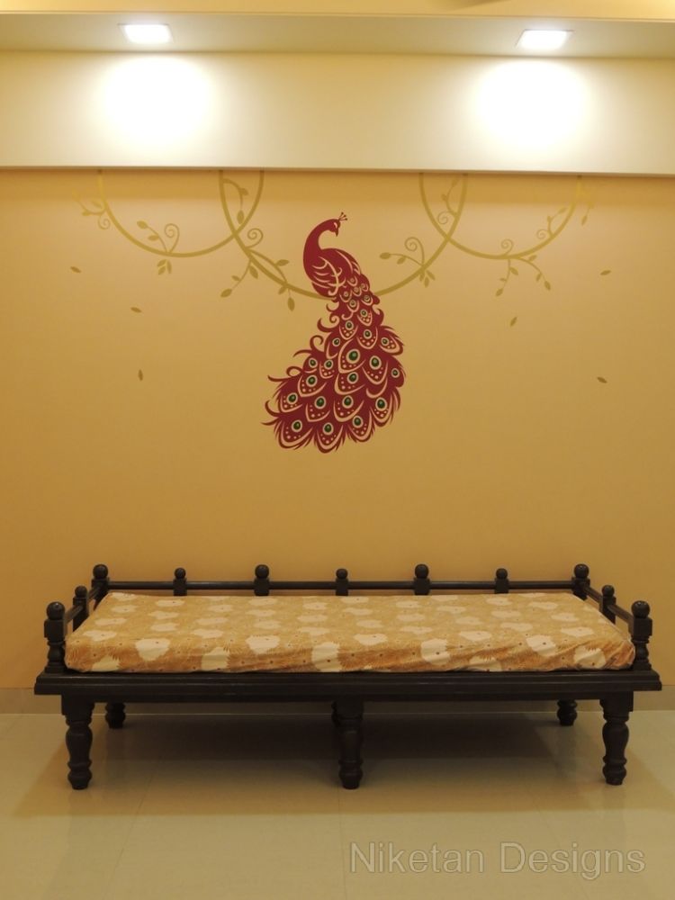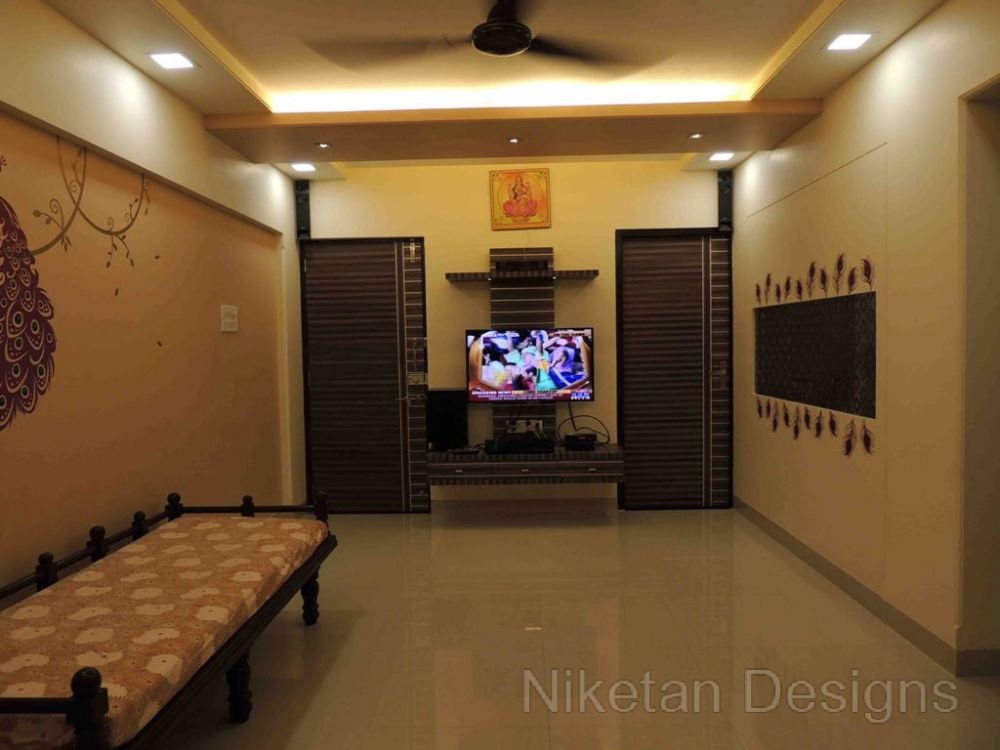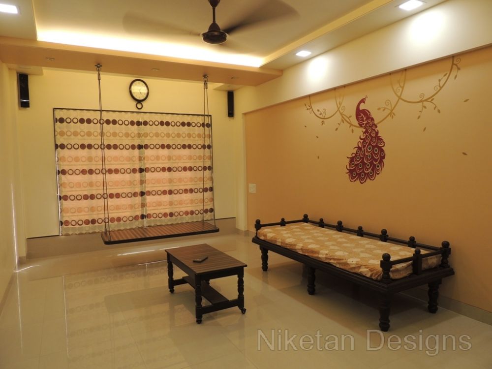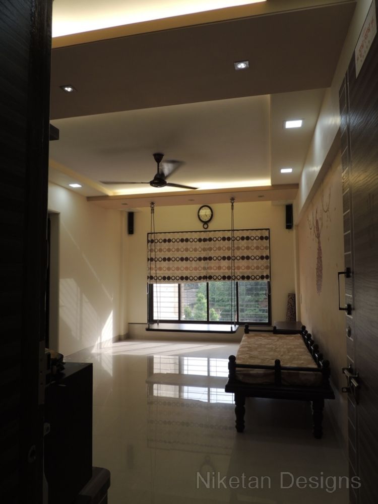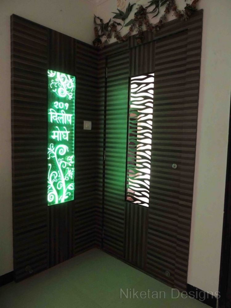 “Back to basics†is the phrase that comes to mind when we think about how we designed the house for Mr. Kedar Moghe. We did the interior designing of his house by combining a traditional theme and modern materials which gave us a unique outcome. The old fittings were re-used to create the new ones to judiciously save money. The decal floral theme was used across the house giving a soothing effect, especially with the lightings. The space containing the swing was converted to sitting area while the kitchen and the living room were separated by a false partition. Two things really made Mr. Kedar Moghe’s family ecstatic about their residence – the composition of the temple space and nameplate created with light effects through a deep frost glass.