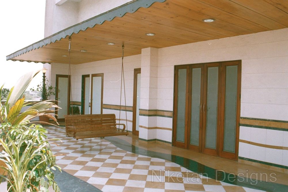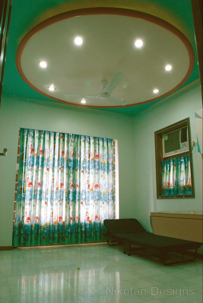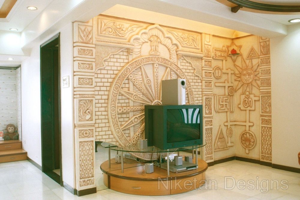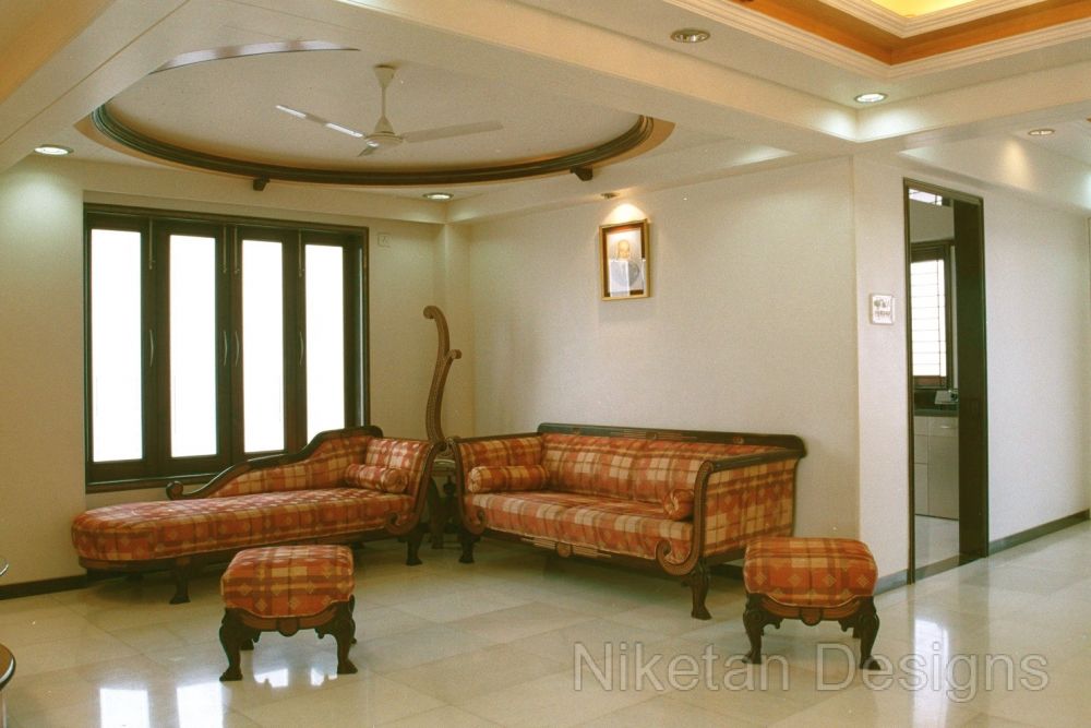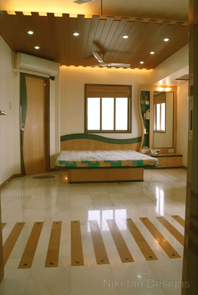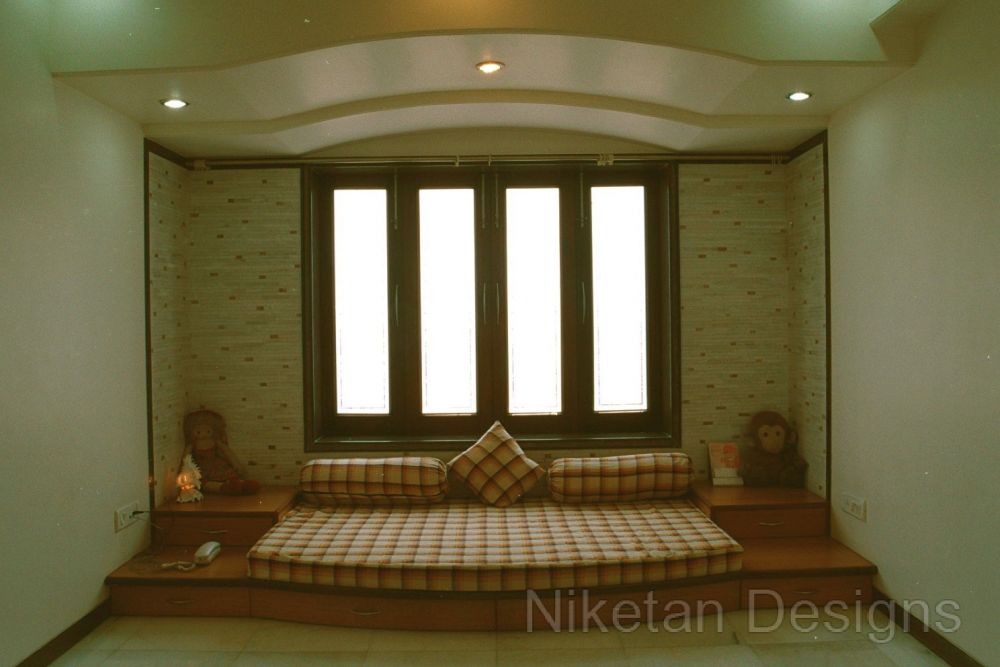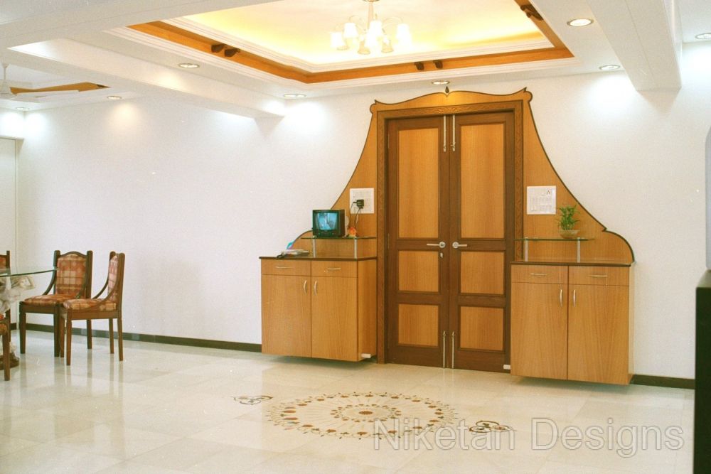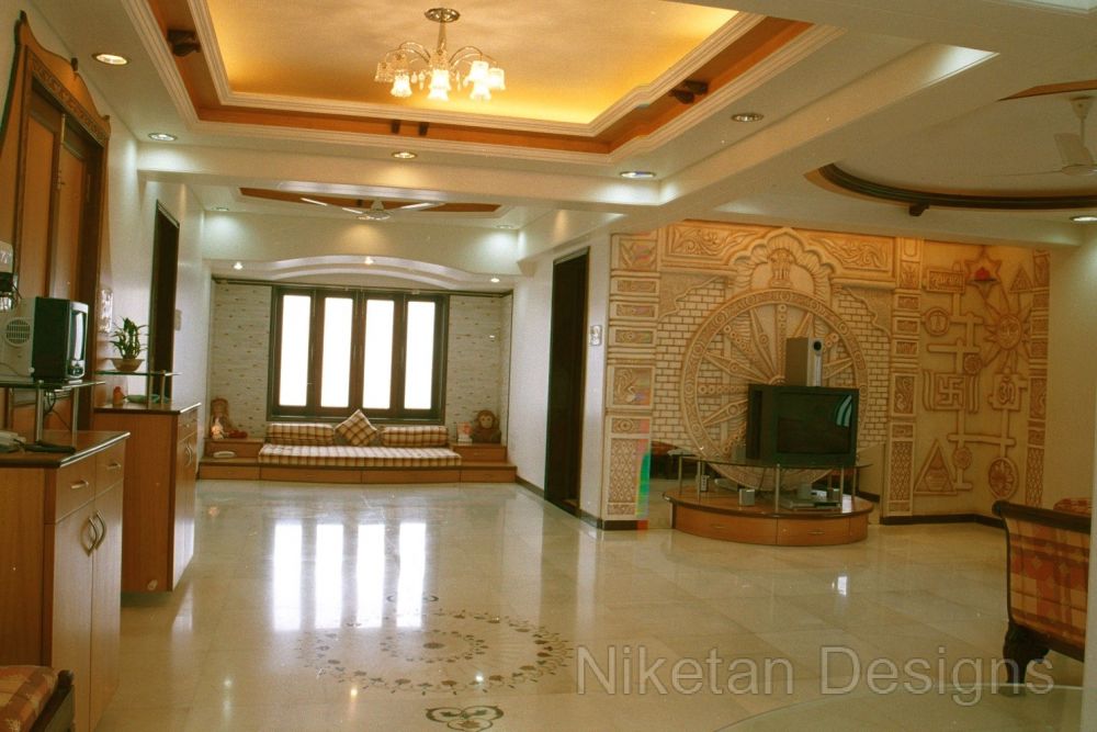 We had a creatively challenging time working on Mr. Madan Shah's 4BHK spacious home at Matunga. The directive was to keep things 'out of the box' and make them look elegant at the same time. One of the highlights of this project was the use of marble inlay work on the floor of the living room. This marble work is a blend of mother of pearl, Italian marble, red parlato and the Indian green marble. Jaisarmal yellow marble inlay was used to decorate the the floor of the master bedroom. We put in place a few unconventional things such as designing a curved shape kitchen platform, convex ceiling of children's room, round shaped sink, etc. A magnificent siporex sculpture of vastu signs graces the backdrop of TV unit and adds to the beauty of ethnic-styled living room which also has an Indian style sitting and a traditional soft set with fibre optic lights.