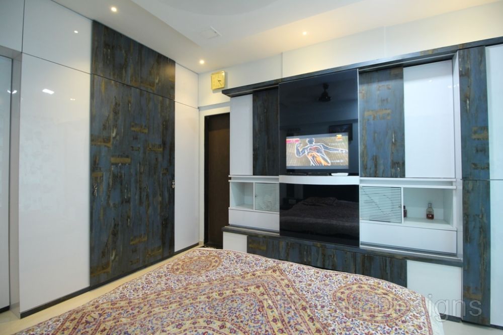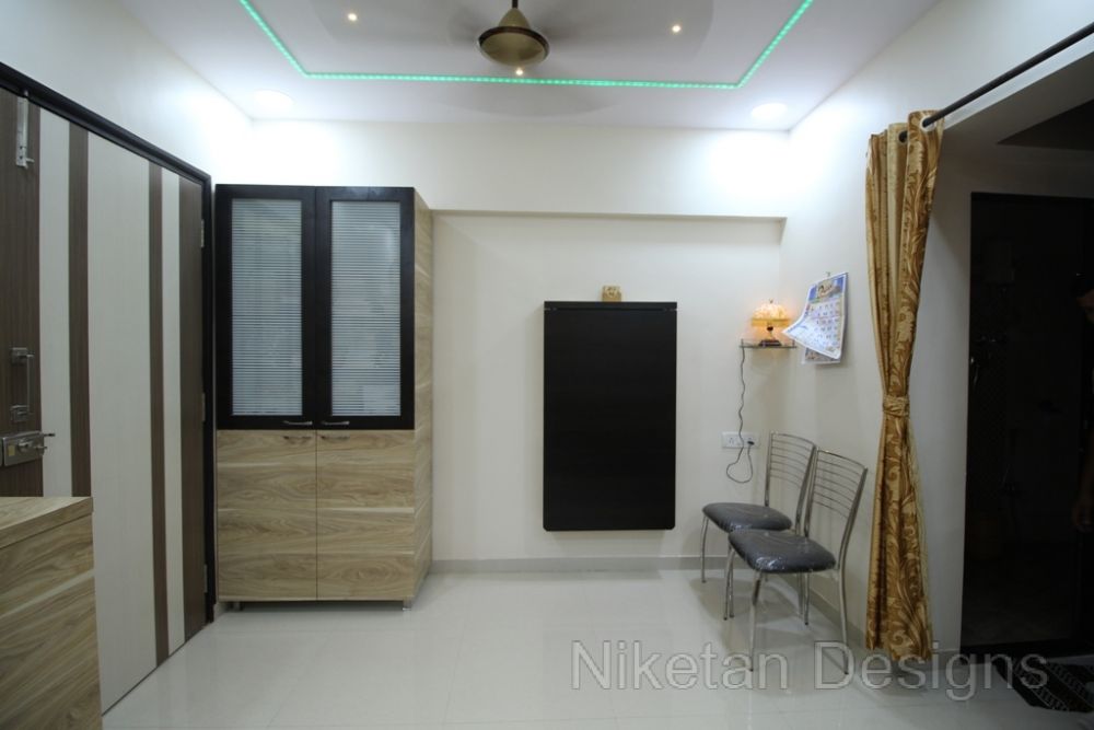Mr. Prabhudesai (1BHK Residence in Andheri - East) Creativity is intelligence having fun, and we had loads of such fun when we renovated the residence of Mr. Prabhudesai and converted this 1BHK into an apartment of modern amenities. The focus was on creating a spacious living room with the state of art technology. The creativity lied in positioning the TV unit in the living room with a rotating view that could be seen from the dining area. The cabinet designed for the bedroom has a sliding TV panel which can be moved on either side of the cabinet. A magic mirror (black painted glass), is installed behind the TV so that the viewing experience is not hampered by the stuff kept in the cabinet when the TV is on. The final touch which enhanced the entire view of the apartment was the use of rustic blue and white combination laminates.