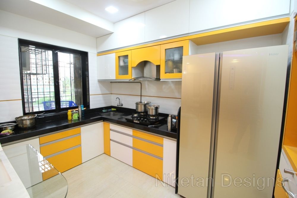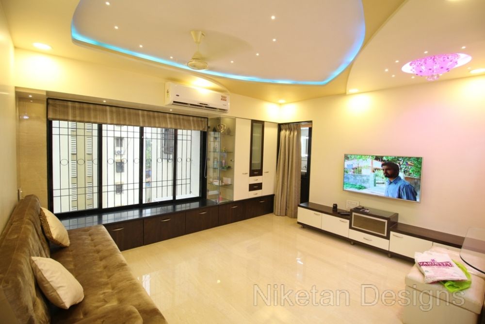Mr. Shailesh Rajadhyaksha (2 BHK Residence in Jogeshwari East) To bring in freshness and uniqueness to this house, we designed this with an open kitchen concept. The customer had a preference for a triangular design on the kitchen partition wall and to complement this, special lights were fixed on the ceiling. The colour of these ceiling lights changes with the click of a button. To satisfy our client's love for music, the chandelier was fitted with Bluetooth speakers. The grand look of the living area is enhanced because of the granite seating area, storage unit and the spotlight on the paintable wall paper. The highlighted tiles and acrylic ceiling added to the design quotient of the bathroom. The jute-type wall paper gave a classy and relaxing look to the master bedroom. The grand finale of the renovation of the entire apartment was the special light effect on the door.